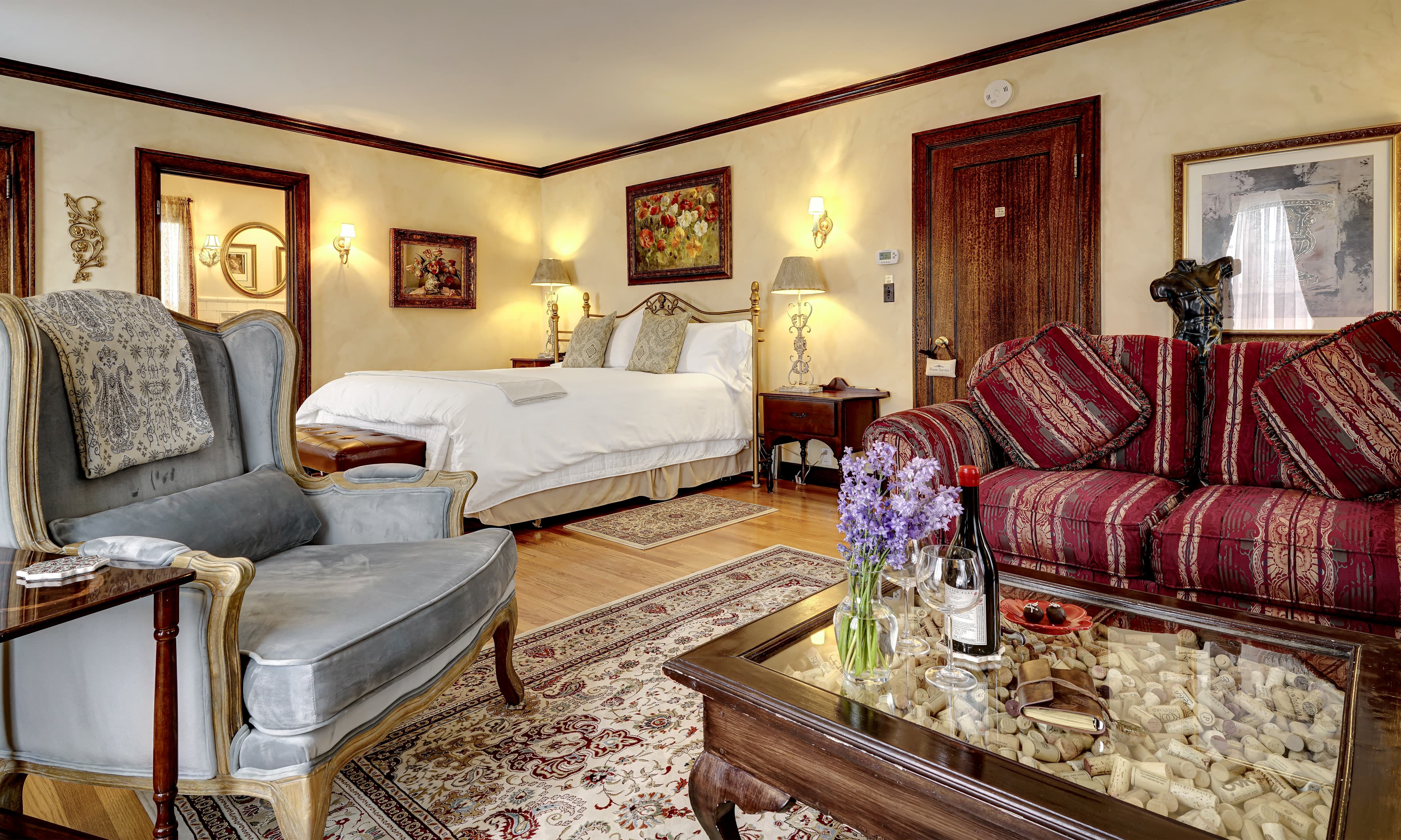 You'll enter our grand salon complete with soft seating, card games and gas fireplace for your group gatherings. Our well-known, three-course, gourmet breakfast, included in your lodging rate, will be served in our cheery dining room. This room is available for your use during the day and evening for games and takeout/delivered meals. A' Tuscan Estate offers catering if your group would like to enjoy box lunches for a day of wine tasting or dinner on property. Arrangements need to be secured seven days prior to arrival and are